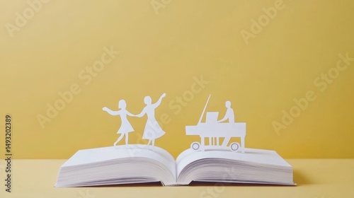 A creatively crafted paper scene depicts two dancers and a pianist emerging from an open book against a vibrant yellow background, This image is perfect for educational materials, art projects