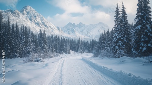 A cross-country skiing trail winding through a snowy forest at the foot of a mountain range.