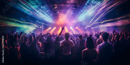 A crowd of people in a music event, dancing in neon color lights