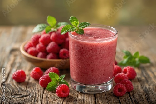 A cup filled with raspberry smoothie accompanied by fresh raspberries