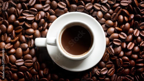 A cup of aromatic coffee in a white mug, scattered coffee beans around