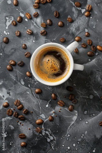 A cup of coffee with beans and a cup filled with coffee beans surrounded