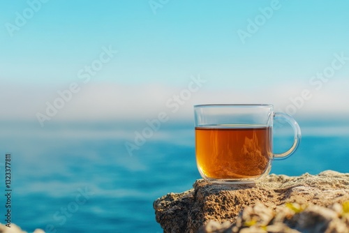 A cup of tea is sitting on a rock by the ocean. The scene is peaceful and serene, with the sound of the waves in the background. The cup of tea is the focal point of the image