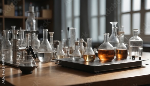 A curious laboratory setting filled with glass vials and intriguing scientific apparatuses in a cozy room