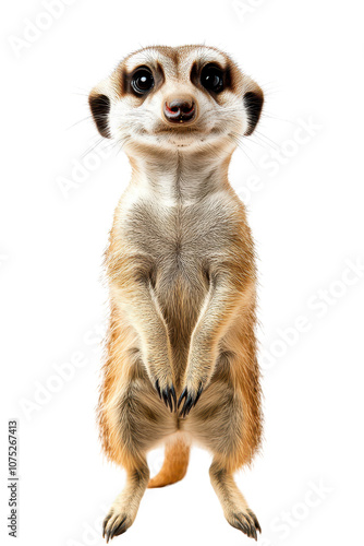 A curious meerkat stands upright, showcasing its playful nature and keen awareness of surroundings in a vibrant setting, transparent background.