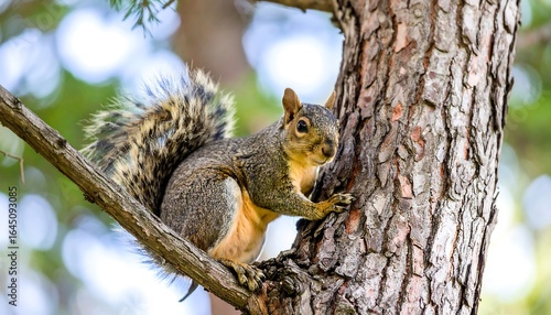 A curious squirrel perched on a tree branch surveys its woodland domain