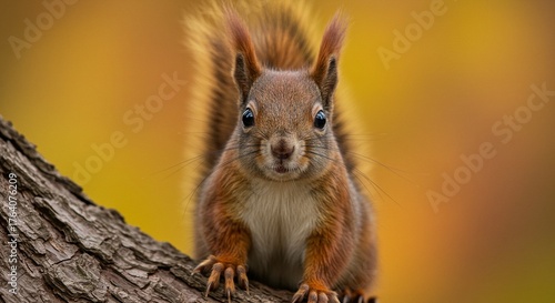 A curious squirrel poses on a tree branch, framed against a vibrant, colorful background.