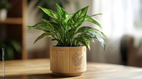 A custom engraved bamboo plant pot featuring vibrant green plant, perfect for adding touch of nature to any space. This eco friendly decor piece enhances ambiance beautifully