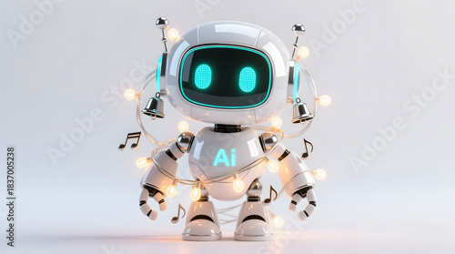 A cute AI robot is playfully entangled in a string of warmly glowing fairy lights and decorative silver bells.