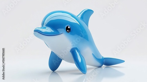 A cute blue dolphin toy with a white belly on a white background.