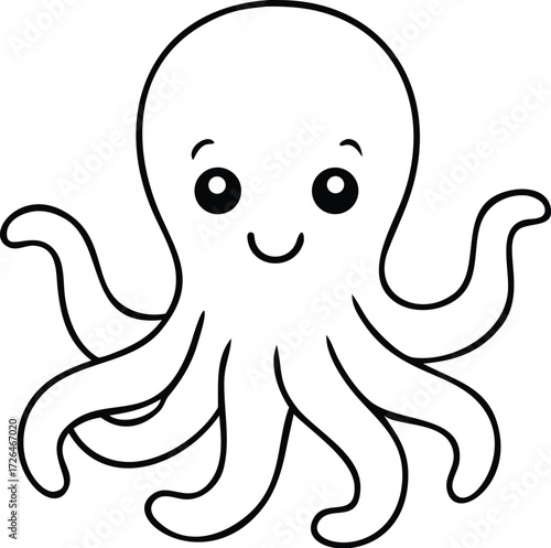 A cute cartoon baby octopus with a big smile is a funny marine animal vector illustration with a fish friend