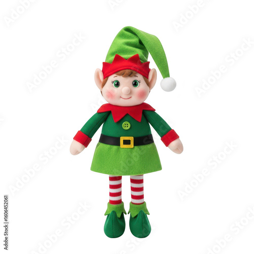 A cute christmas elf toy wearing a green outfit red and white striped socks and a pointed green hat with a white pompom isolated on transparent background