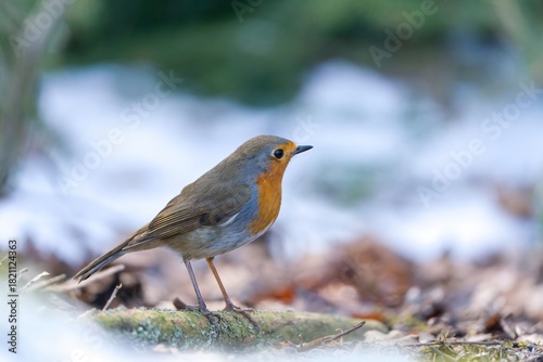A cute european robin looks for food on the ground in winter. Portrait of a redbreast in the nature habitat. Erithacus rubecula