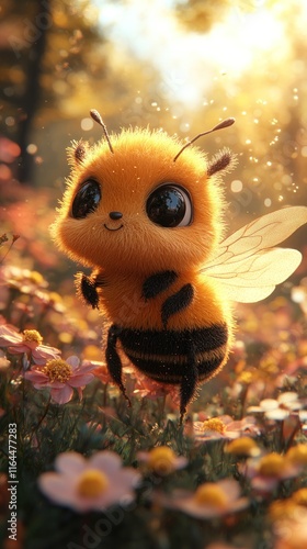 A cute, fluffy bee smiling amidst colorful flowers in a sunlit meadow.