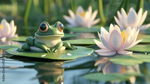 A cute frog sits on a lily pad surrounded by water lilies in a serene pond setting.