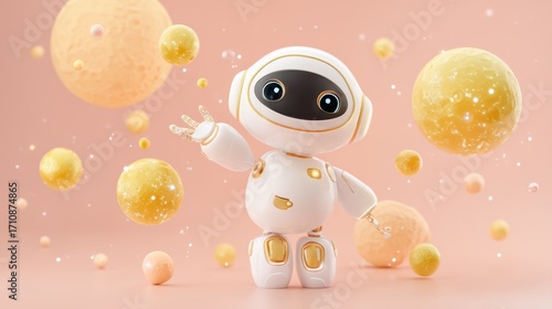 A cute, futuristic robot with a friendly face interacts with colorful spheres against a soft pink background, cute robot with space for text
