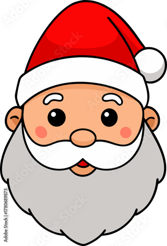 a cute smiling Santa face with fluffy white beard and red hat, simple clean flat cartoon icon style, no background.