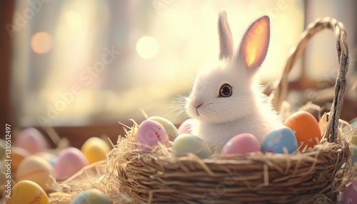 A cute white bunny with big, curious eyes sits in a wicker basket surrounded by colorful, decorated Easter eggs. The so on blur backgroundft lighting adds a warm and cheerful festive atmosphere.