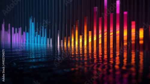 A D bar chart in metallic shades showing financial trends, with reflections on a glass surface and a dark professional background.