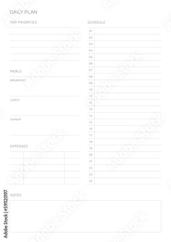 A daily plan design template in a modern, simple, and minimalist style. Note, scheduler, diary, calendar, planner document template illustration.