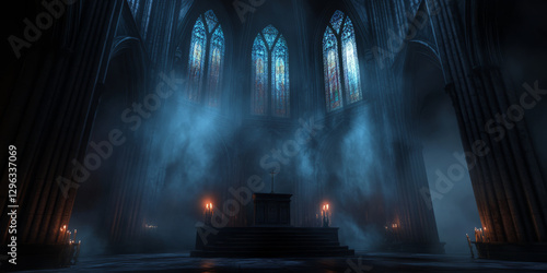 A dark gothic cathedral 3D background featuring a grand stone podium. The towering stained-glass windows cast eerie colored light, while flickering candles and mysterious fog add a hauntingly