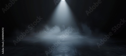 A dark room with a light shining on it. The light is creating a shadow on the ground