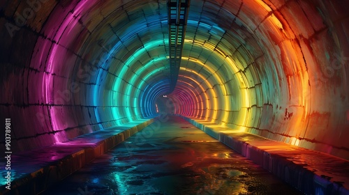 A dark tunnel illuminated by a spectrum of rainbow colors creating a vibrant, surreal atmosphere