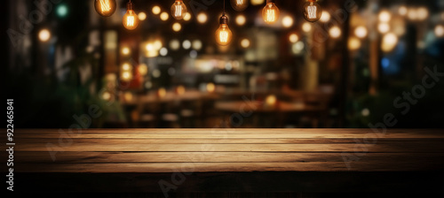 A dark wooden table with a blurred background of a bar or cafe interior at night, illuminated by vintage Edison bulb lights. The foreground has a flare light effect, creating an empty space