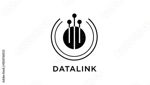 A datalink logo with three vertical lines and three circles inside of two curved lines in black and white