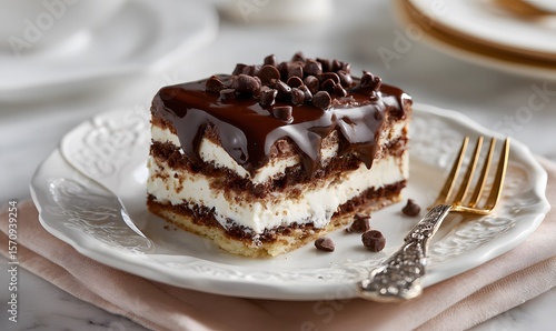 A decadent layered chocolate and cream cake, topped with glossy chocolate ganache and chocolate chips, served on an ornate white plate with a decorative fork. Generative AI