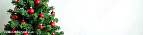 A decorated Christmas tree with red and green ornaments against a bright white background, decorative branches, holiday decor, green