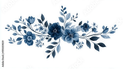 A decorative floral arrangement in shades of blue with various flowers and leaves.