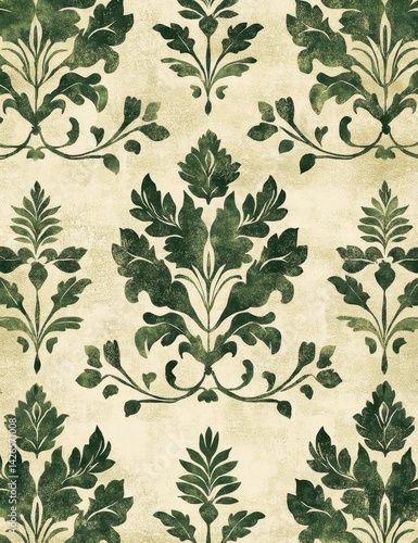A decorative pattern featuring intricate green floral designs on a light background, perfect for textiles or interior design.