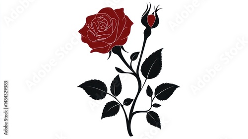 A deep red rose with a bud, black stem and leaves, set against white