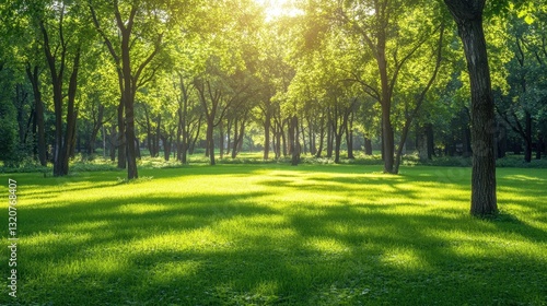 A defocused green landscape with dappled sunlight shining through tree canopies, evoking a tranquil outdoor setting