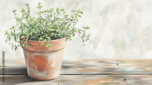 A Delicate Arrangement of Fresh Thyme in a Rustic Terracotta Pot, a Beautiful Still Life Botanical Art Piece, Perfect for a Rustic Farmhouse Style Home Decor