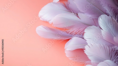 A delicate arrangement of pale purple feathers resting on a pastel coral background, highlighted with subtle shadows and plenty of copy space.
