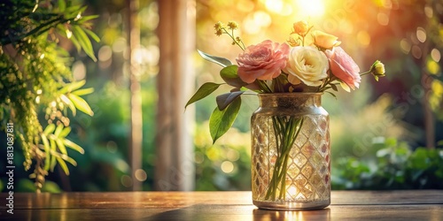 A delicate bouquet of pastel flowers in a textured glass vase, bathed in warm sunlight, rests on a wooden surface, creating a serene and peaceful outdoor scene.
