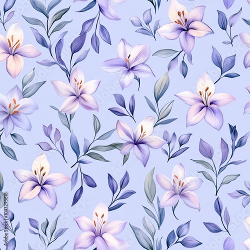 A delicate floral pattern featuring soft purple lilies and green leaves against a light blue background.