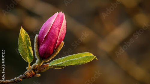 A delicate pink magnolia bud is on the cusp of blooming, perched on a branch with tender green leaves, signaling the arrival of spring in a nature setting.