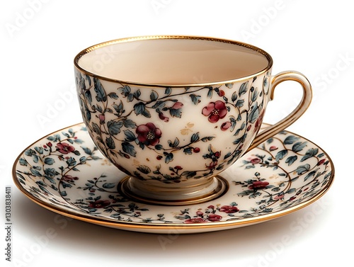 A delicate porcelain teacup with hand-painted floral patterns and a gold-rimmed edge on a matching saucer