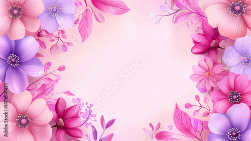 A delicate watercolor floral frame with pink and purple flowers and leaves creates a beautiful romantic background perfect for invitations cards or wedding designs.