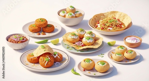 A delicious and colorful assortment of popular Indian street food chaat dishes, including pani puri and sev puri, arranged on a clean white background.