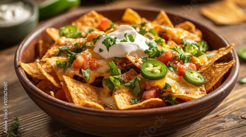 A delicious bowl of loaded nachos with cheese, jalapenos, and sour cream.