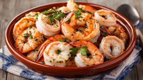 A delicious plate of grilled shrimp garnished with herbs, served in a rustic dish, showcasing vibrant colors and textures.