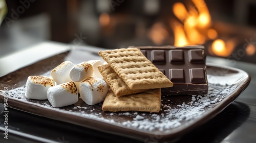 A delicious spread of chocolate, marshmallows, and crackers, perfect for a cozy night in. The warm glow of candlelight creates a inviting atmosphere.
