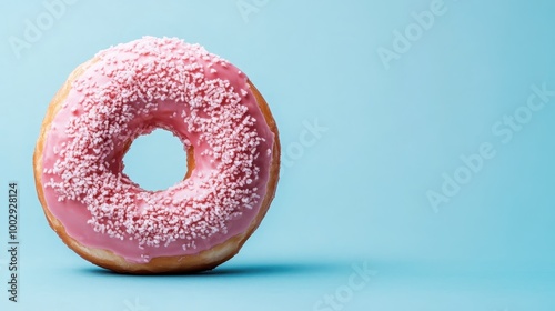 A delicious-looking donut covered in pink icing topped with white sprinkles set against a blue background, creating an appetizing contrast in food photography.