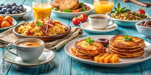 A delightful spread of breakfast foods, including fluffy pancakes, savory egg dishes, fresh fruit, and refreshing beverages, all arranged on a vibrant blue table.