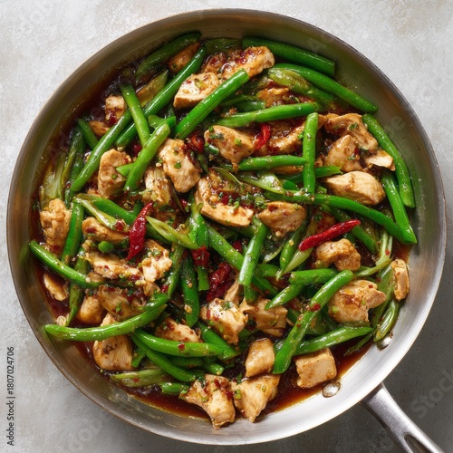 A delightful stir-fry showcases tender chicken pieces with crisp green beans, all coated in a savory sauce. This dish is perfect for a quick weeknight meal filled with taste and nutrition
