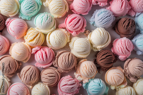 A dense arrangement of ice cream scoops in various flavors and colors, filling the entire frame. The ice cream features a range of hues from pastel pinks and blues to rich chocolate browns.